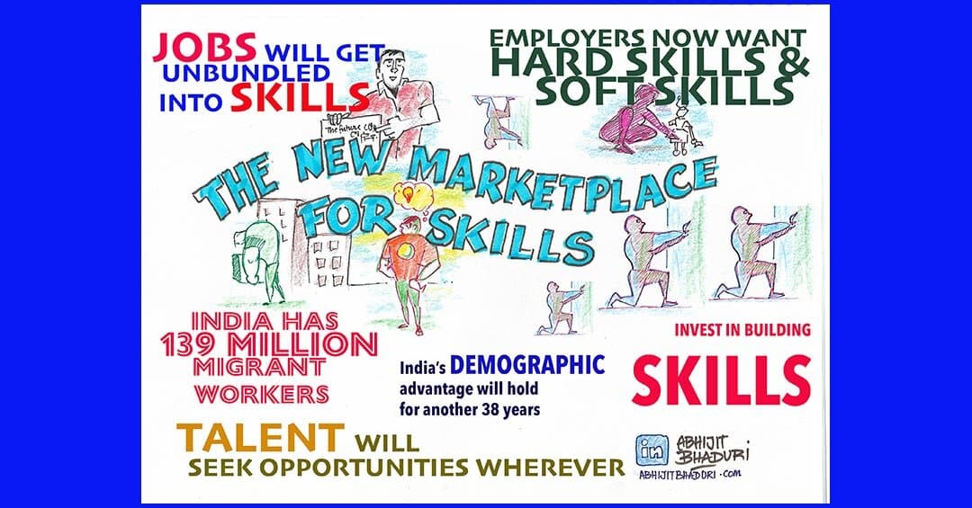 LinkedIn recently analyzed all the job postings that employers have made and stated that there are at least 50,000 professional skills in the world. So which ones will make you most sought after? LinkedIn5 has the answer — from soft skills like creativity and adaptability, to hard skills like AI and data science, the list is long.And employers today want both hard and soft skills. The stereotype of the socially clumsy nerd is a thing of the past. Today’s marketplace looks for people who can embrace new technology and solve problems with their creativity. Once they have figured out the solution, they need to collaborate with others to implement the ideas. In a world that is in perpetual beta, being able to adapt quickly is an important requirement.Leadership Skills,LinkedIn states that the five hard skills in demand are: Cloud computing, Artificial Intelligence, Analytical Reasoning, People Management and User Experience Design. It is interesting to note that People Management is now being termed as a “hard skill”. I am sure User Experience design will become a mandatory skill to have even for HR leaders and not just for Developers. When it comes to soft skills, creativity is the most sought-after skill. Creativity matters more than ‘previous experience’ because most problems do not have a precedent. Persuasion skills and adaptability to collaborate makes an employee sought after. Given that each one of us is juggling multiple priorities that are often changing, being able to manage one’s time does, significantly matters. That is also a sought-after skill.While the hard skills will keep changing, the soft skills will be useful anyway. The new skills economy will need focused attention by the government and the employers. Five decades of opportunity is more than what any other country in the world has or will ever have. It is not an opportunity for us to lose and squander away. If you don’t believe in waiting for someone else to build these skills in you, just get started on your own.Like the sketchnote? Feel free to download it and use it. May I request you to share this article on your social media posts? Thanks. Follow more than 800,000 who are with me on LinkedIn. Or on Instagram and Twitter @AbhijitBhaduri—————–A version of this appeared in the Feb 2019 Issue of People Matters <click here>References1 https://www.livemint.com/Opinion/zgCdZ3GrDwtDpQWD95HenO/Opinion–Indias-demographic-dividend-will-play-out-over-a.html2 https://unemploymentinindia.cmie.com/https://www.weforum.org/agenda/2017/10/india-has-139-million-internal-migrants-we-must-not-forget-them/https://www.facebook.com/TheEconomist/videos/494223171077508/https://learning.linkedin.com/blog/top-skills/the-skills-companies-need-most-in-2019–and-how-to-learn-them