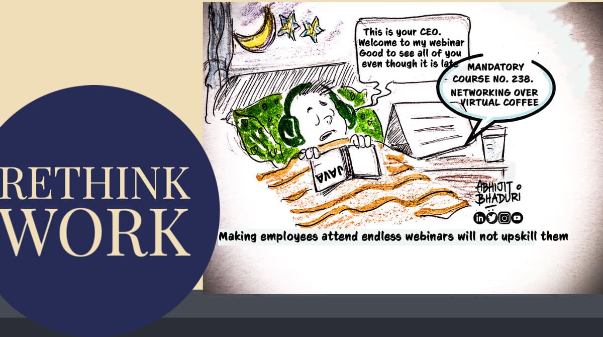 Kavi Arasu, an expert in organisational effectiveness and learning design, says, “Instead of re-imagining work in this new setting, we simply assume that the same work is happening in a different location — the home.”“Speaking to a zoom camera does not turn it into a webinar. Familiarity with PowerPoint is not the same as facilitating learning. Dumping endless hours of meaningless webinars onto the employee is not going to get them up skilled. Learning has to be re-imagined for this new medium. The classroom has moved”, says Kavi.1. The learner has millions of choices: An employee attending an online course at home is not the same as the employee attending a training programme in the office. Binge-watching slickly-produced serials and movies has refined our standards. Sandhya, employee of an audit firm, says, “The office meeting or online course has to be better than the Netflix movie I could watch instead.”Employees are anxious about their future. That needs to be addressed by the head of the business. Learning is a social experience. Online courses must provide that.2. Communicating through video – a new competency: Most online classes are excruciatingly boring because they have the speaker continue for long stretches without involving participants. This can be done through polls, parallel chats, drawings, videos, quizzes, built in every few minutes. It is hard for the speaker to see the facial expressions of the learner. That is essential to build engagement.If the video experience is not at par with a TED talk, the participants will switch off faster than you think. Learning & Development teams must teach managers how to conduct reviews and give feedback on video, teaching online class and even tell them how long a virtual meeting can go before fatigue sets in. It will help people learn that every meeting does not have to be done through video.Read: How to think like a vlogger on Video Calls
