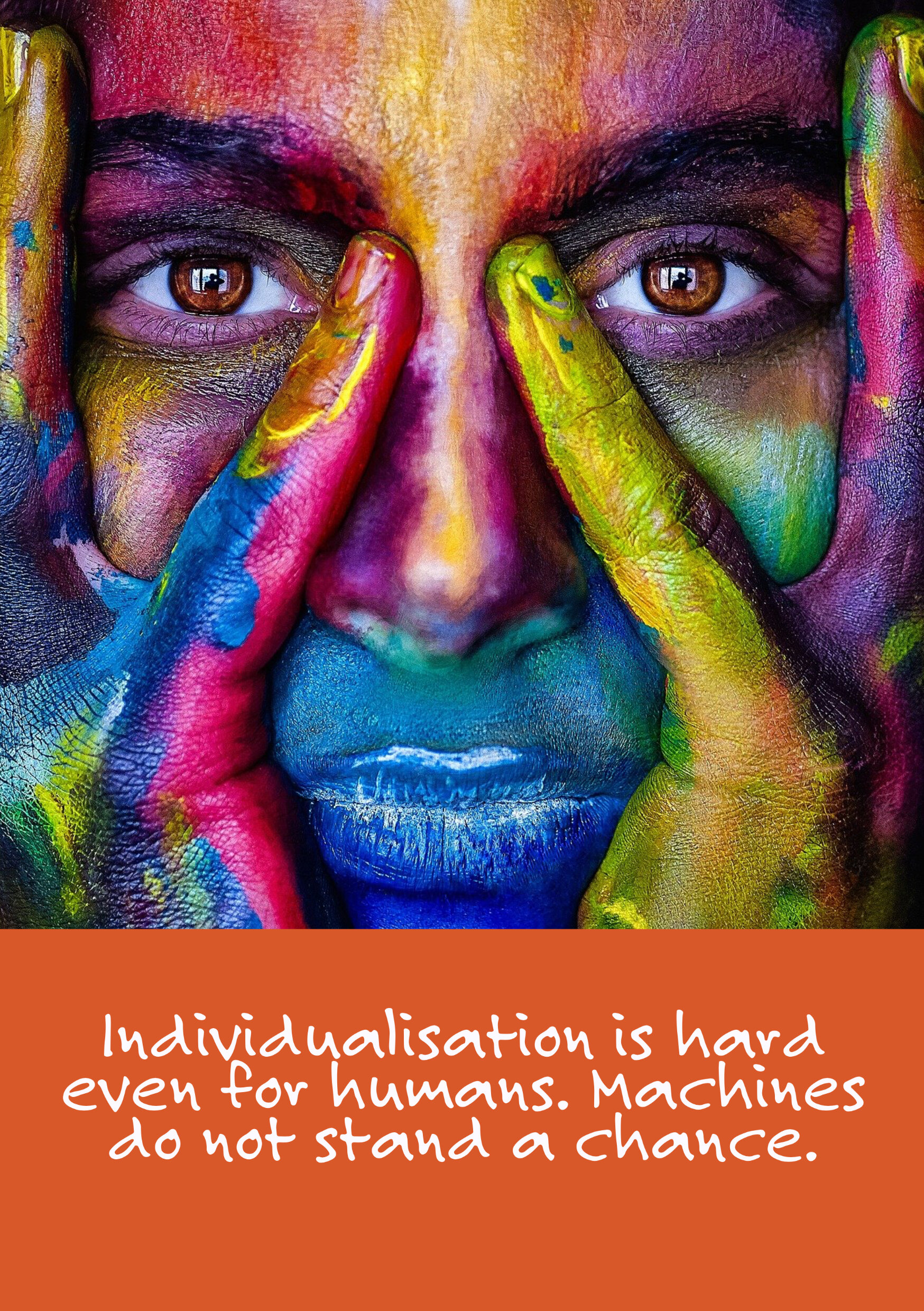 While Machine Learning and AI are great at customisation or even personalisation, individualisation is a deeply human advantage. When people trust another human being they will open up their heart. Being a good conversationalist helps people build deep bonds. That often means being a good listener – not a great story-teller. That is what gives humans an advantage. But we all know being human can be hard for human beings. The future is human.