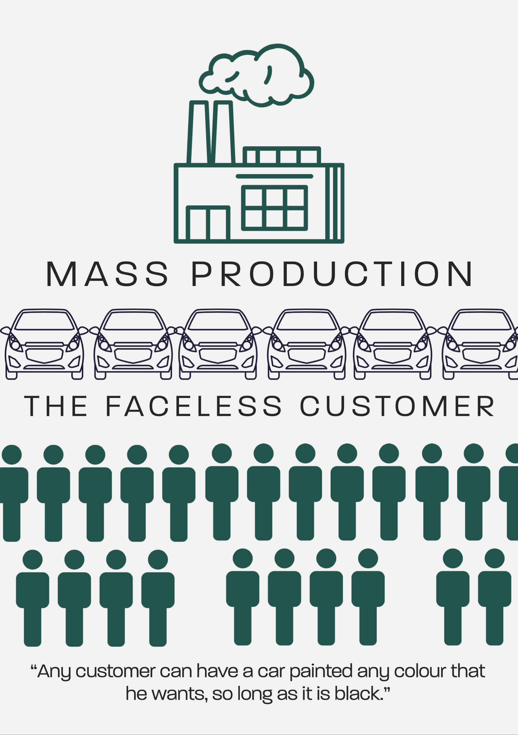 The defining factor of mass production was efficiency. Some say, black colour dried fastest and hence was preferred in the early years. The worker’s impact on the final product was invisible. Charlie Chaplin explains this best in the clip below.