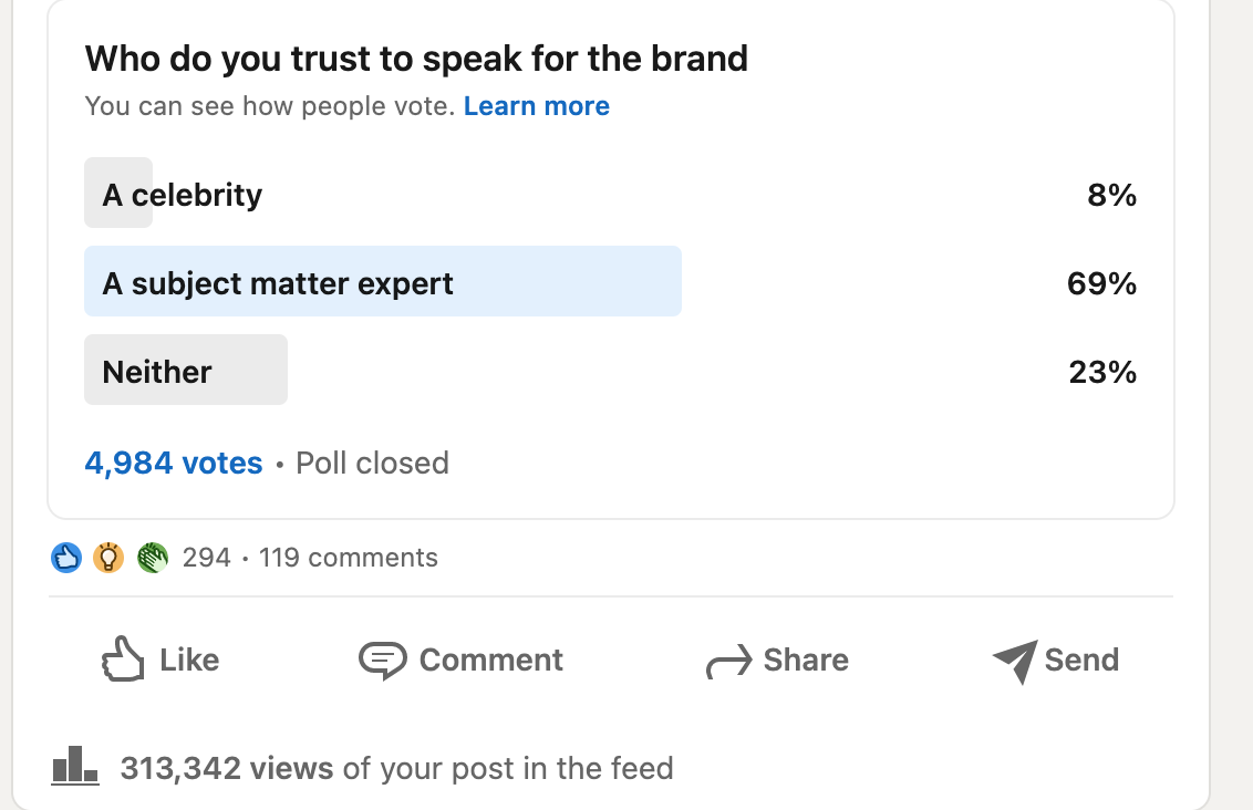 The talent brand needs to be authentic. I ran poll where I had asked, “Who do you trust to speak for the brand?” The post went viral with more than 300,000 views and 69% people trusted an expert to represent the brand. In case of the talent brand, the experts are your employees. Leverage them.