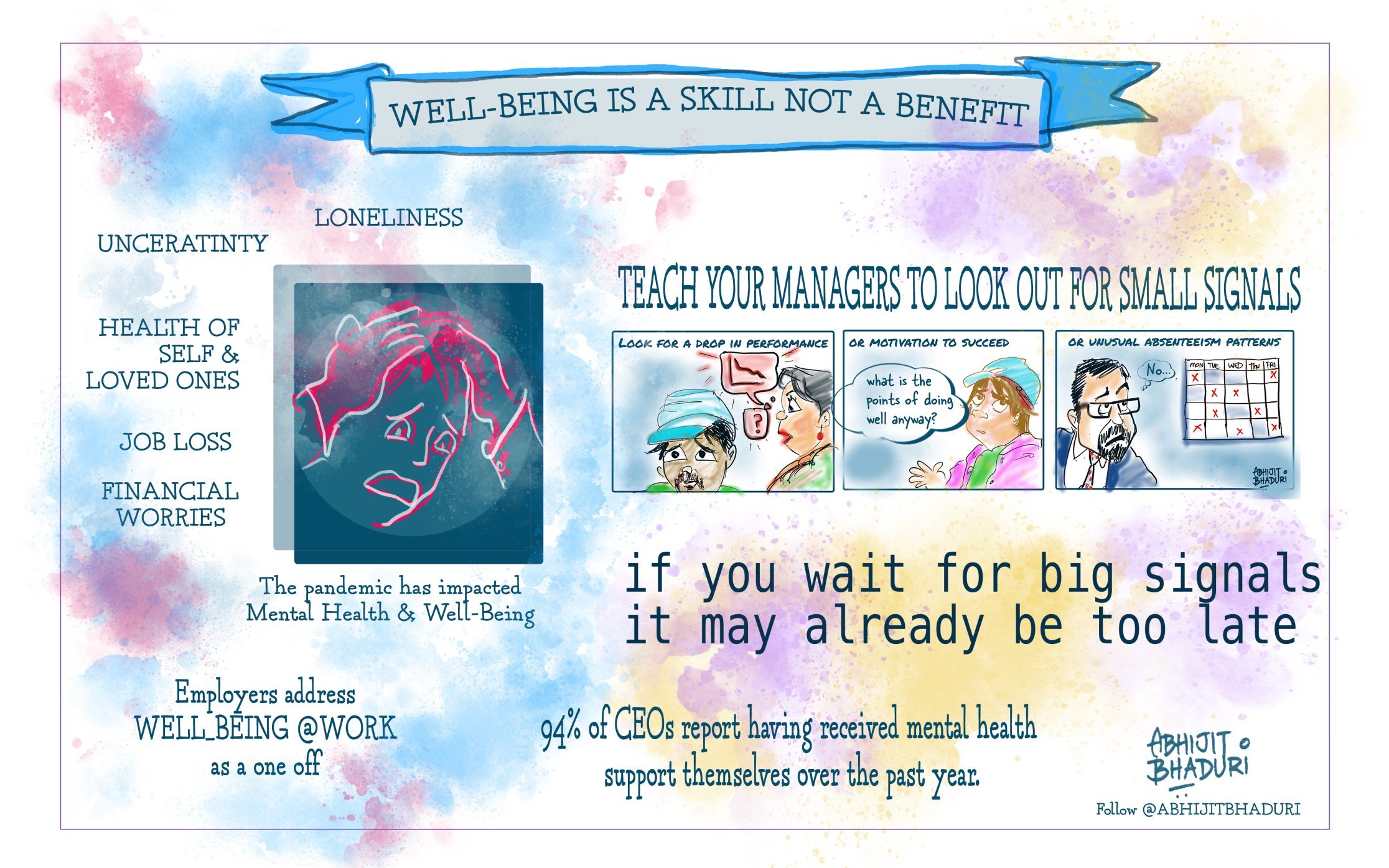 2. A shipping company in Singapore decided to make it a business initiative for 13,000 employees. The CEO is the principle sponsor of the program. Managers and business leaders have got trained to notice small indicators of well-being challenges. “If you are waiting for big signals, it may be too late.”