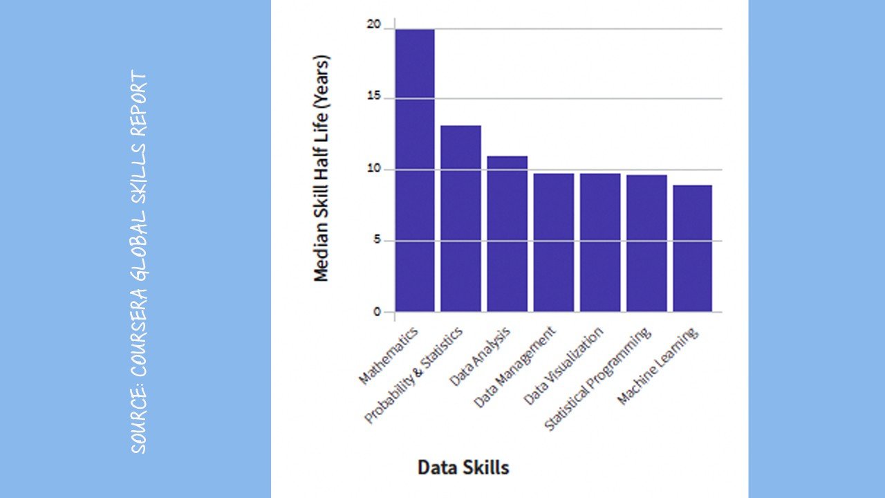 Look at the comparison of the half life of “soft skill” like Leadership and compare it to a “hard skill” like Machine Learning. The Data Analyst skills can be learned in 64 hours. Building resilience and adaptability takes longer to teach but the half life of such a skill is much more.