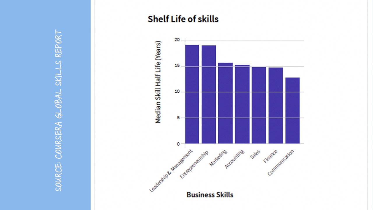 The half life of a skill is shrinking. Half life of a skill is the time taken for a skill to reach half the value in the skill market. In other words if the market pays $100 for a skill, if after seven years, the market pays $50 for the skill, the half life of the skill is seven years. The half life of many skills is shrinking.