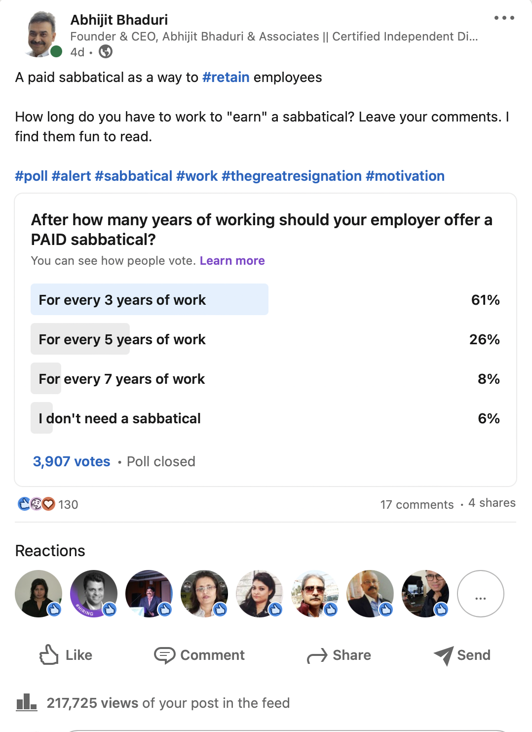 People are keen to build multiple experiences in their career. It may be time to make three years of employment to offer sabbaticals. When I asked readers on LinkedIn, 217,000 readers were asked and more than 3900 people responded and 61% people said, three years of work with an employer was the right time to offer a sabbatical. <read the comments>