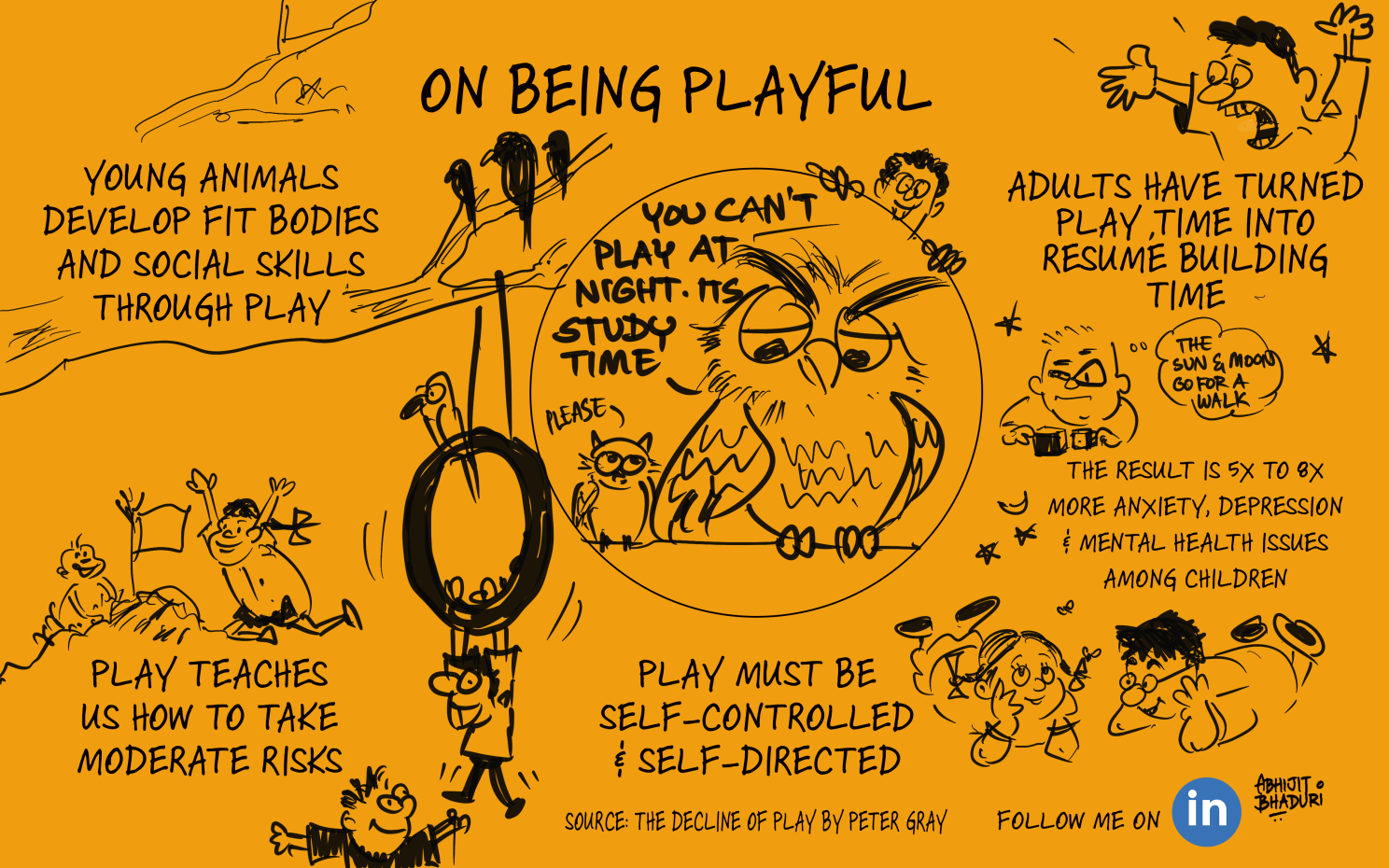 Play nurtures creative ideas. Organizations worry about not having enough creativity among their employees. Yet most employers will celebrate people who will pack in every waking hour to do something which has tangible benefits. Simply allowing for time to socialise at work can unleash creativity in the people. Employees love playing games at an offsite and that rejuvenates them.