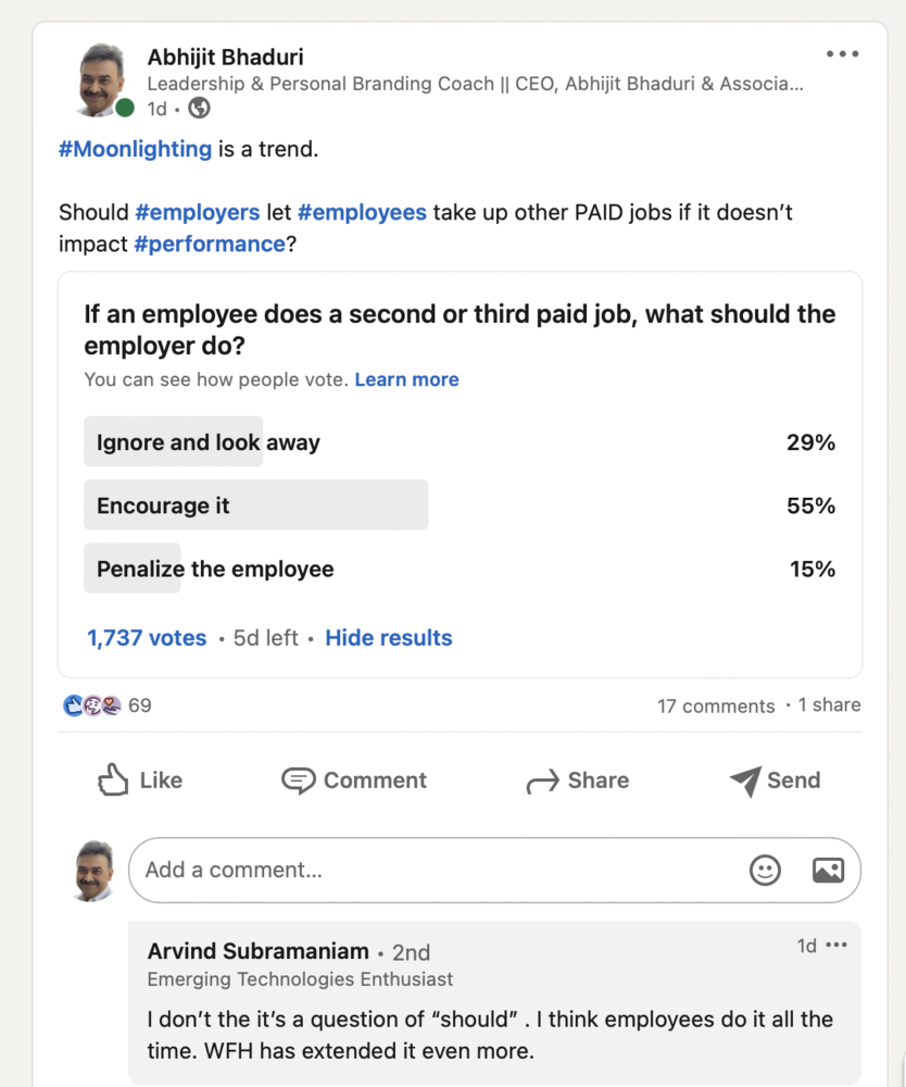 “The Restless Employee” is a thing. They want to build certainty in their lives and explore possibilities independent of the employer’s mostly one-sided view of career paths. A second job or moonlighting (some call it the “side-hustle”) is more common than you think. I asked readers what should the employers do when they find out about an employee who has been moonlighting? <Do read the comments>