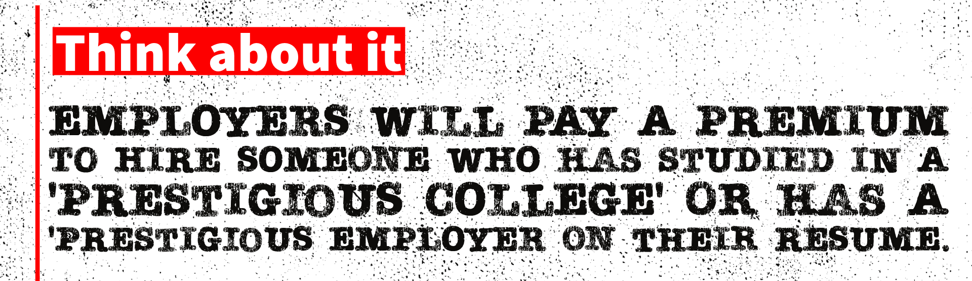 Employers will pay a premium when they spot a “prestigious college” or familiar name of a firm on the resume of a candidate. When such a candidate performs poorly, no one stops to question the assumption. They simply find another candidate to fill the spot. This is the HR equivalent of “no one got fired for choosing IBM”.