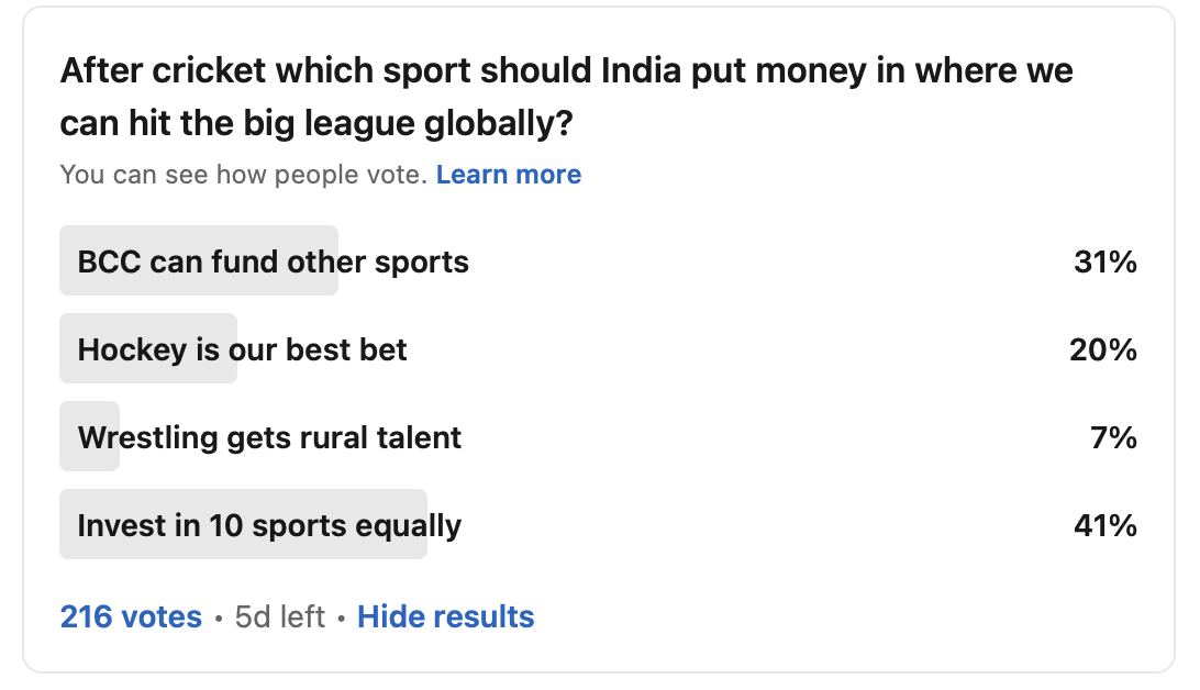 Could some part of the from go from BCCI to fund other sports? Or should we invest in becoming better at field hockey? If we have to bring in rural talent, we could go big on wrestling, a sport men and women have excelled at. Or should we think like a VC and invest the kitty in 10 sports and then we may get one or two BIG wins?