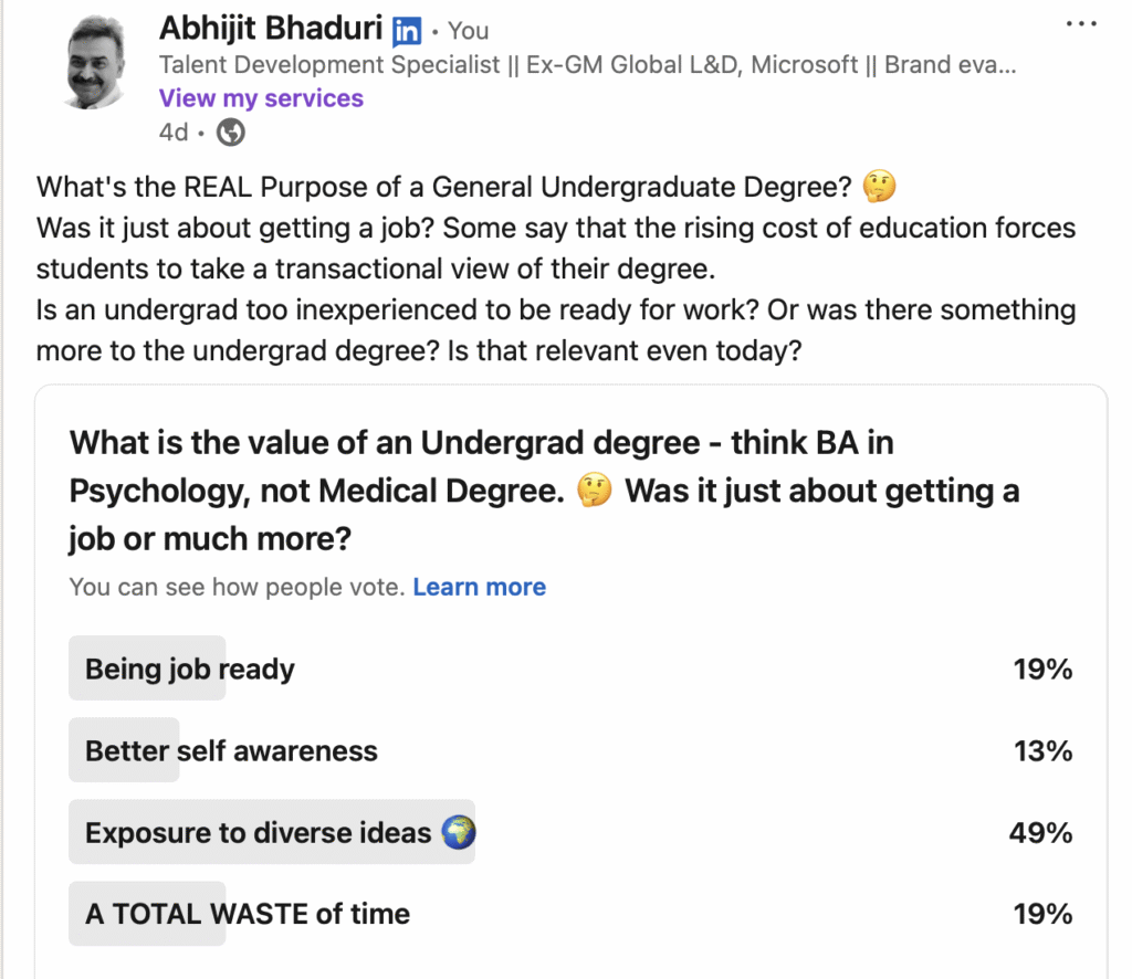 I asked people on LinkedIn what they thought of the real value of an undergraduate degree. Here is what the poll looked like.