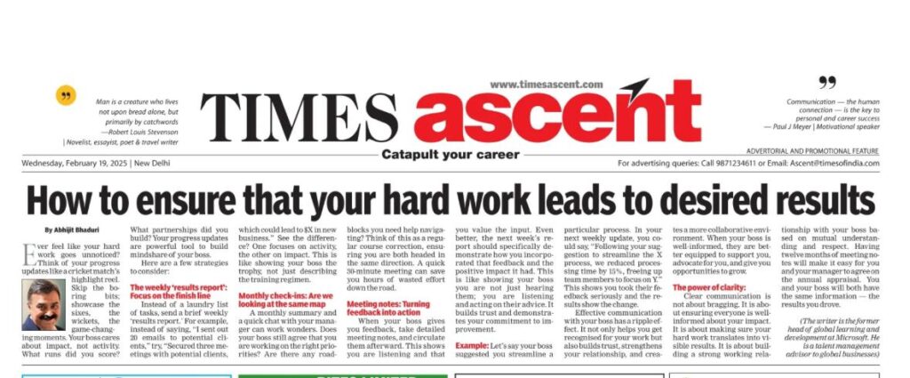 February 19, 2025Published by Abhijit Bhaduri on February 19, 2025Categories IdeasHow to ensure that your hard work leads to desired resultsEver feel like your hard work goes unnoticed? Think of your progress updates like a cricket match’s highlight reel. Skip the boring bits; showcase the sixes, […]