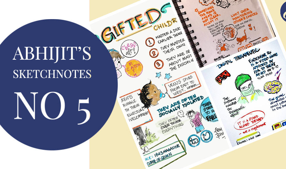 Abhijit's Sketchnotes No 5 explores why FDA is recommending a videogame as a cure. What could be driving this decision. There is a a great sketch about the fear of making mistakes. Yes, there is a term for it. You can know that here and a big question - is it a curse to be a genius? Or worse still the parent of a genius? Read this compelling story